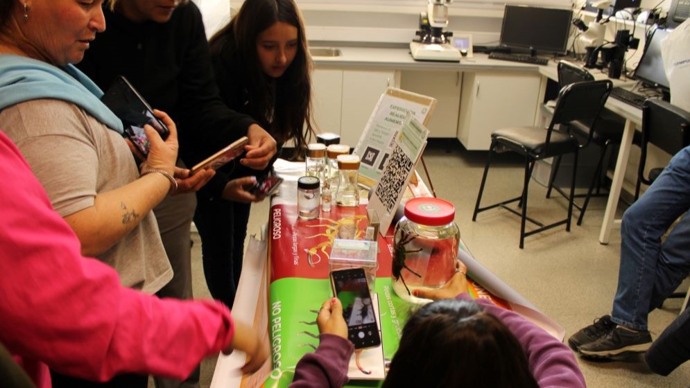 El CEPAVE está enfrentado “en espejo” con relación al ILPLA. Son dos edificios gemelos situados en el predio conocido como el Bosque Este de La Plata, así que sin solución de continuidad el grupo cruzó de un espacio a otro, para conocer las temáticas de investigación de ese centro, el más importante en el estudio de plagas, cuyas líneas van desde parásitos hasta mosquitos de importancia sanitaria, pasando por plagas perjudiciales y protectoras de la huerta, cucarachas, piojos, arañas y gusanos. Allí, divididos/as en grupos, recorrieron laboratorios y otros espacios, donde conocieron acerca de las distintas especies de arañas y escorpiones; insectos plaga y sus enemigos naturales; hongos; protozoos; parásitos; mosquitos; piojos y diversos organismos de ecosistemas acuáticos.