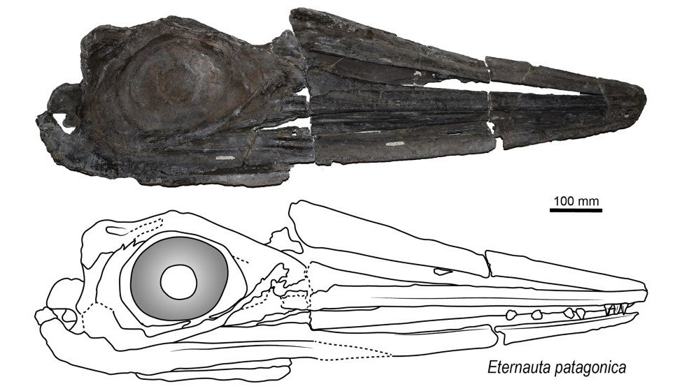 Investigadores e investigadoras del CONICET en la Facultad de Ciencias Naturales y Museo de la Universidad Nacional de la Plata (FCNyM, UNLP) y de la Universidad Nacional de Río Negro (UNRN) acaban de comunicar el hallazgo de Eternauta patagonica, un nuevo género y especie de ictiosaurio, es decir un grupo de reptiles marinos que dominó los mares durante más de 160 millones de años hasta su extinción a principios del Cretácico Superior, hace unos 100 millones de años atrás. Aunque sin parentesco alguno, su cuerpo era semejante al de los delfines o tiburones actuales, lo que los ubica como el paradigma de la adaptación al medio acuático marino. La novedad fue posible gracias al análisis de parte de un esqueleto (el cráneo, una aleta anterior, dientes y costillas) de unos 150 millones de años de antigüedad que fue hallado en la década del ’80 en la Formación Vaca Muerta, al norte de Neuquén, y se reporta en la revista Historical Biology.