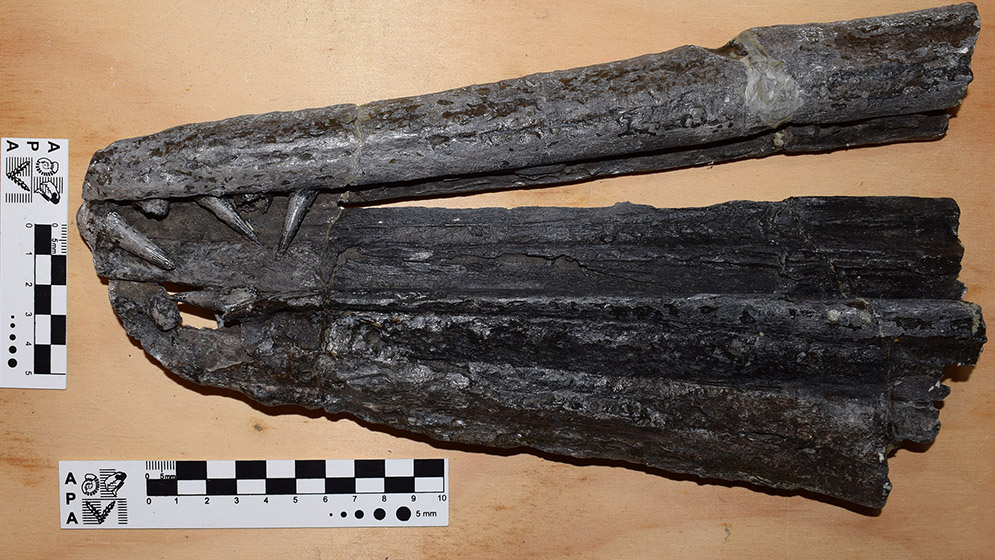 “Fue un animal de dimensiones importantes, ya que solo el cráneo mide cerca de un metro de largo, con lo que estimamos que su cuerpo completo rondaría los cinco o seis metros”, cuenta Lisandro Campos, becario del CONICET en la FCNyM y primer autor del trabajo. “A lo largo de la evolución, su cráneo fue elongándose hasta formar un rostro o una trompa muy larga completamente cubierta de dientes súper afilados, lo que nos llevó a preguntarnos de qué se alimentaba y cuál era su estrategia para la captura de las presas”, comenta.