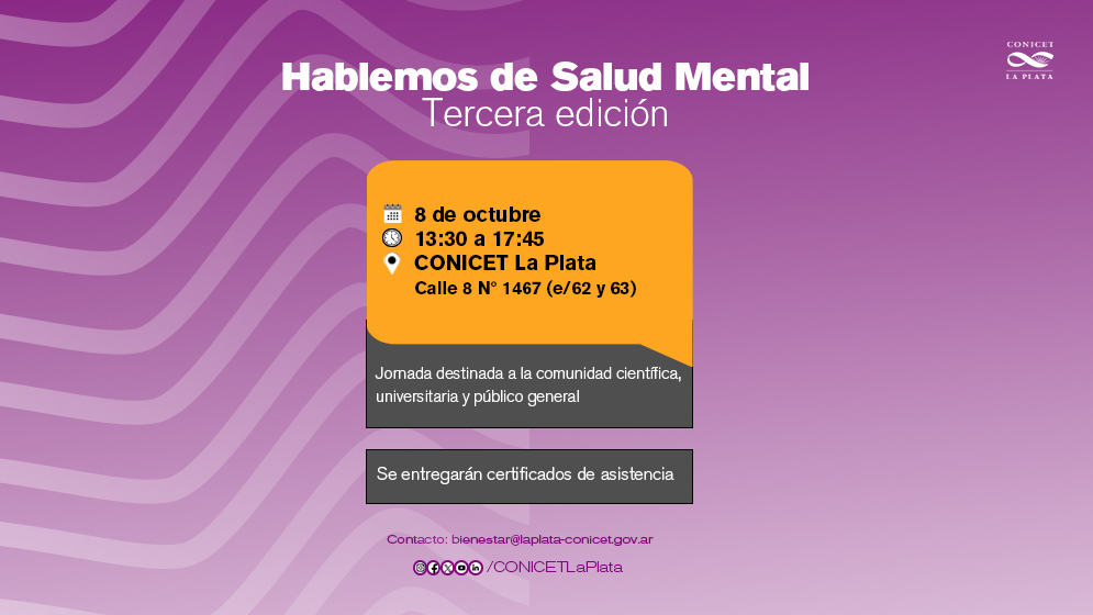 El próximo miércoles 8 de octubre tendrá lugar la tercera edición del ciclo “Hablemos de salud mental”, una propuesta impulsada por el CONICET La Plata que se realiza anualmente desde 2023 con el objetivo de concientizar sobre la importancia de la salud mental como política pública e institucional, generar un espacio de discusión y debate en torno a las problemáticas recurrentes de salud mental, reflexionar sobre temáticas invisibilizadas socialmente y acerca del impacto de diversos procesos sociales y culturales en las subjetividades, y trabajar en la construcción de espacios y herramientas para el acompañamiento, prevención y promoción de la salud mental dentro de los organismos institucionales. La actividad se desarrollará desde las 13:30 en el salón auditorio del CONICET La Plata, ubicado en 8 Nro. 1467 entre 62 y 63 y la apertura estará a cargo del director del organismo, Gonzalo Veiga.